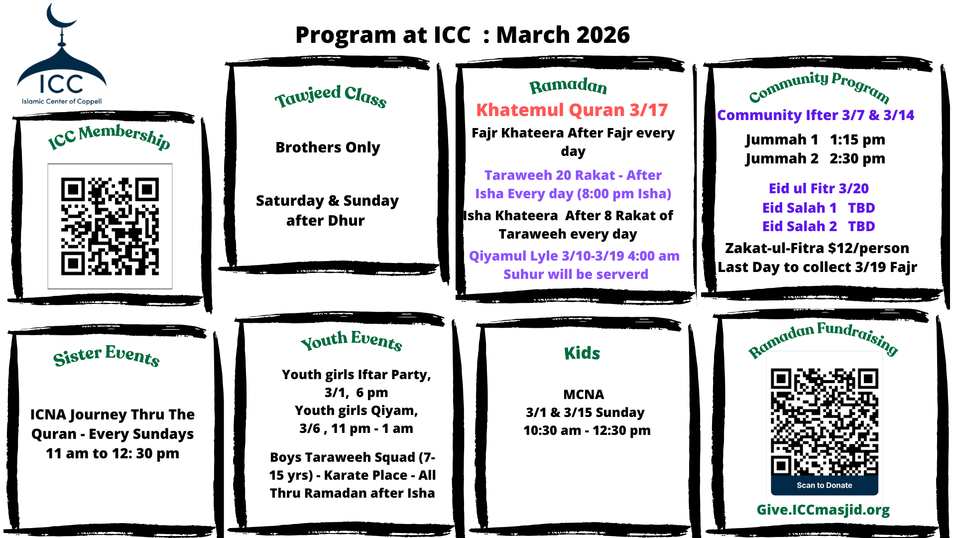 Register your kids up for our weekly Qur’an program offered by ICC during the school year. This program is for both boys & girls and is lead by Sh. Jawad ur Rahman.